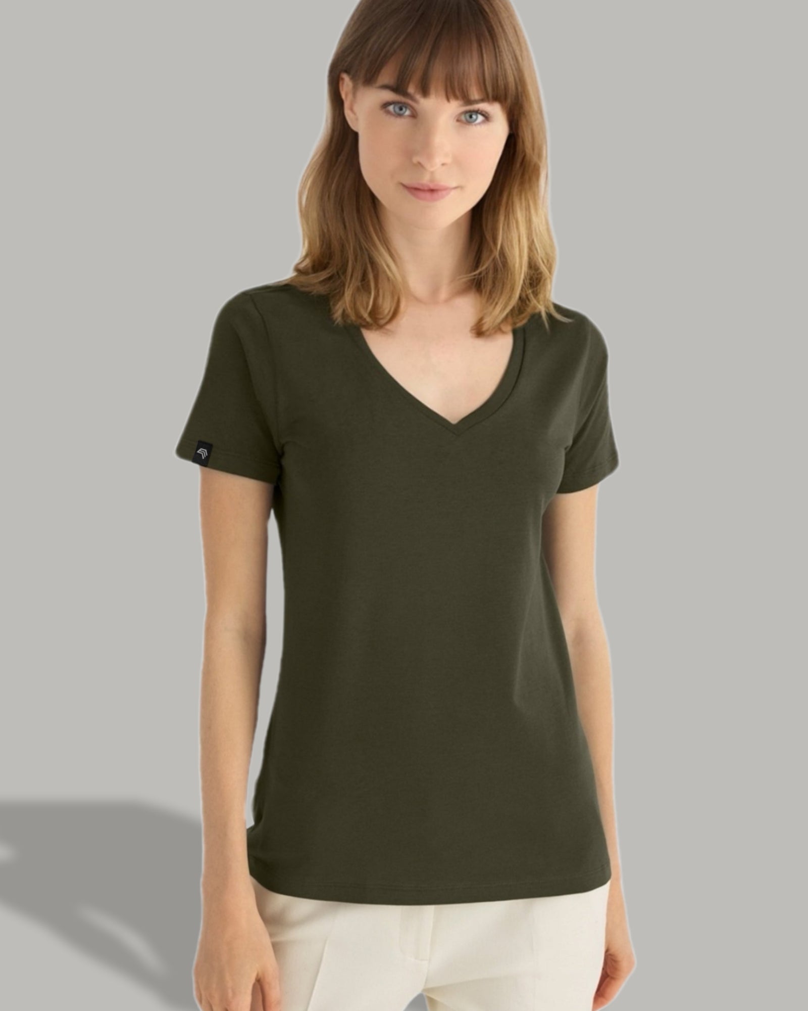 6 weitere Farben erhältlich » Modell "BAC TW045" ― Leichtes Damen Bio-Baumwolle T-Shirt mit V-Ausschnitt. Material: 140 g/m² • 100% Baumwolle (Bio-Baumwolle), gekämmt und ringgesponnen • Single Jersey • Leicht taillierter Schnitt (bitte Maße abgleichen, Größentabelle bei den Bildern) • Schmaler, mitteltiefer V-Ausschnitt aus Rippstrick • Nackenband • Doppelnaht an Ärmelabschluss und Bund • Seitennähte • Besonders weiche und ebenmäßige Oberfläche. Auch mit Rundhalskragen erhältlich.