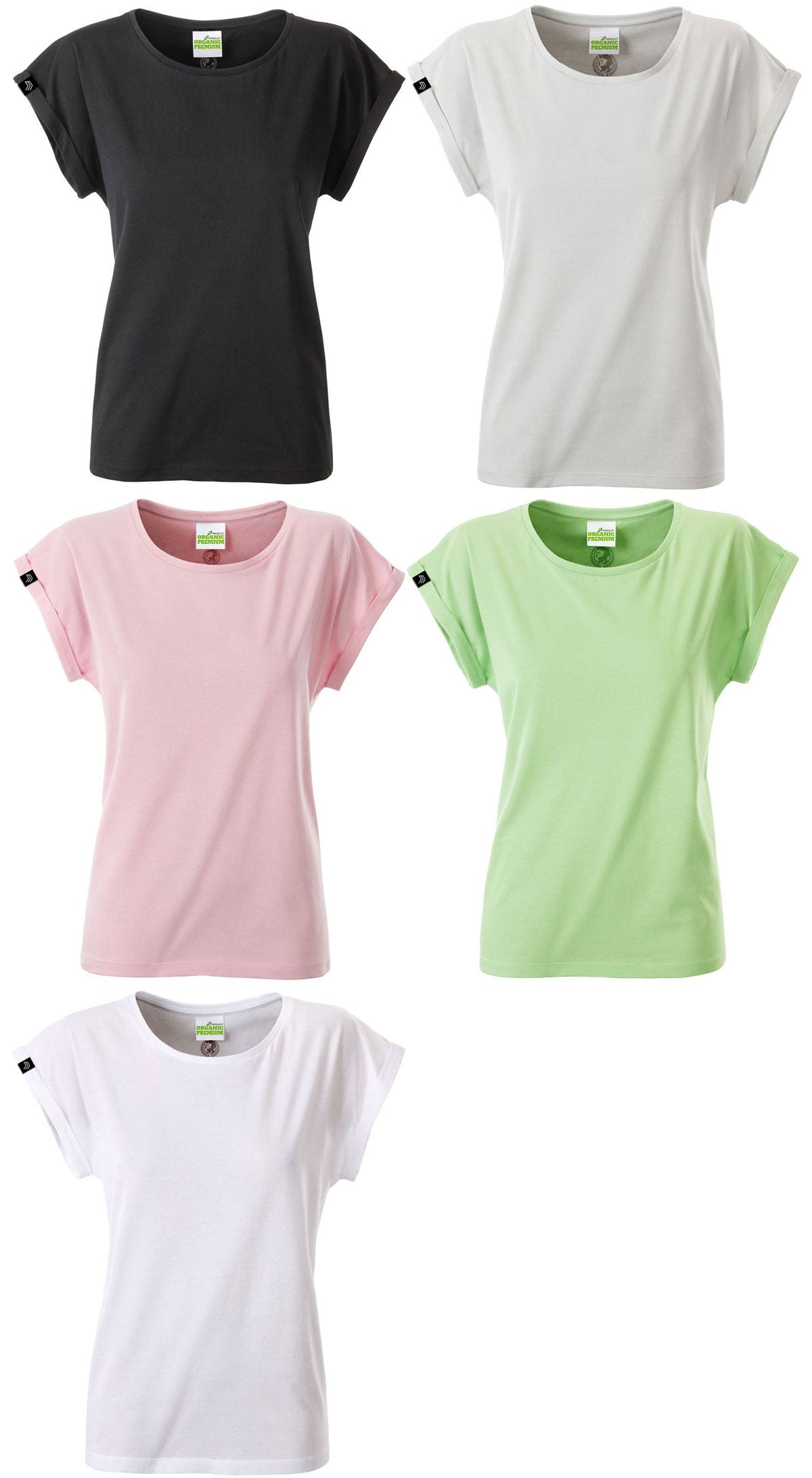 More colors available » Model "JAN 8005" ― Ladies' Casual T-Shirt Organic. Material: 120g/m², 100% cotton (organic), casual loos fit (size table at pictures, please check your measurements), low cut round neckline, cuffs with elastane, cuffs with elastane, overcut shoulder, short roll-up sleeves. // JAN8005 Companier Tshirts