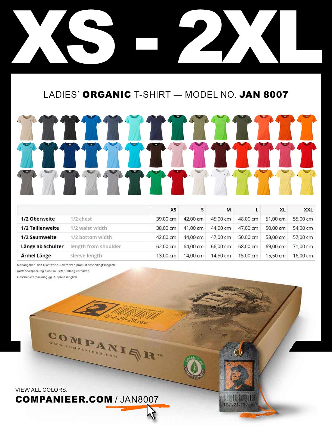 45 more colors available » Model "JAN 8007" ― Lightweight Women's Basic Organic Cotton TShirt. Material/Grammage: 120 g/m² lightweight, 100% cotton (organic), single jersey, slightly waisted (size chart at pictures, please check your measurements), low cut round neckline, cuffs with elastane, wonderful, soft quality, smooth grip. // JAN8007 Organiccotton Girlie TShirt Girlies