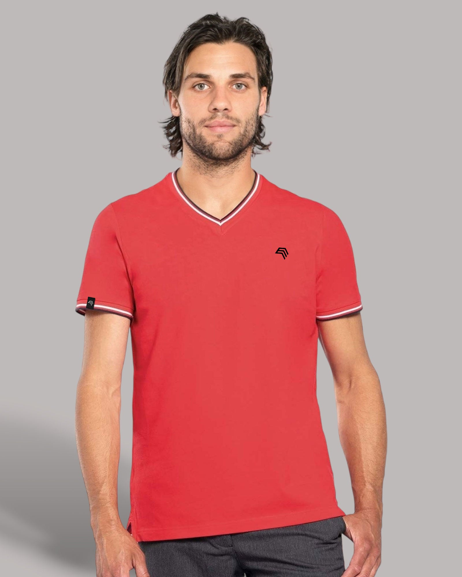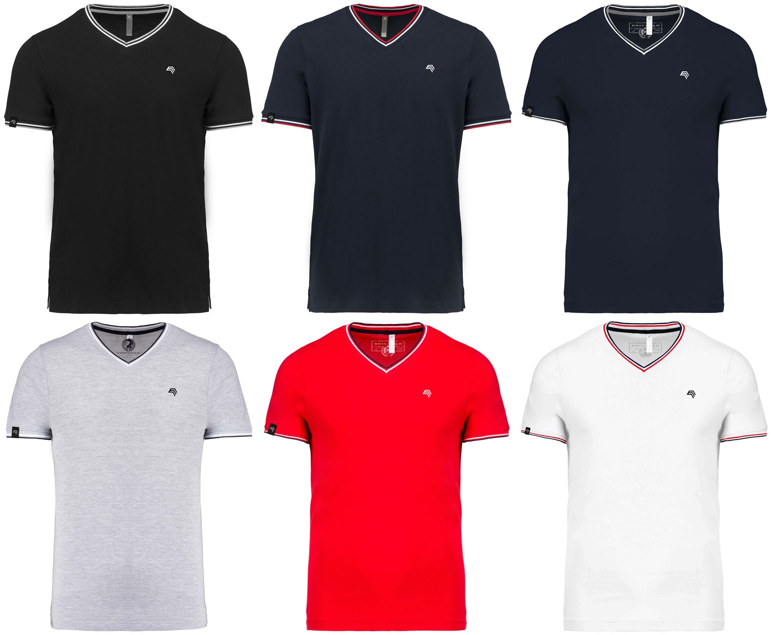 6 more colors available » Model "KRB K374" ― Men's Piqué V-Neck TShirt with multicolored contrast stripes. Material: 170g/m², 100% cotton (combed cotton piqué), rib finishing with contrasting stripes at neck and cuffs, contrasting taped neck and side slits, twin needle finishing at hem. Size chart at pictures: Please compare your measurements before purchasing! // V-Kragen V-Ausschnitt collar KRB374