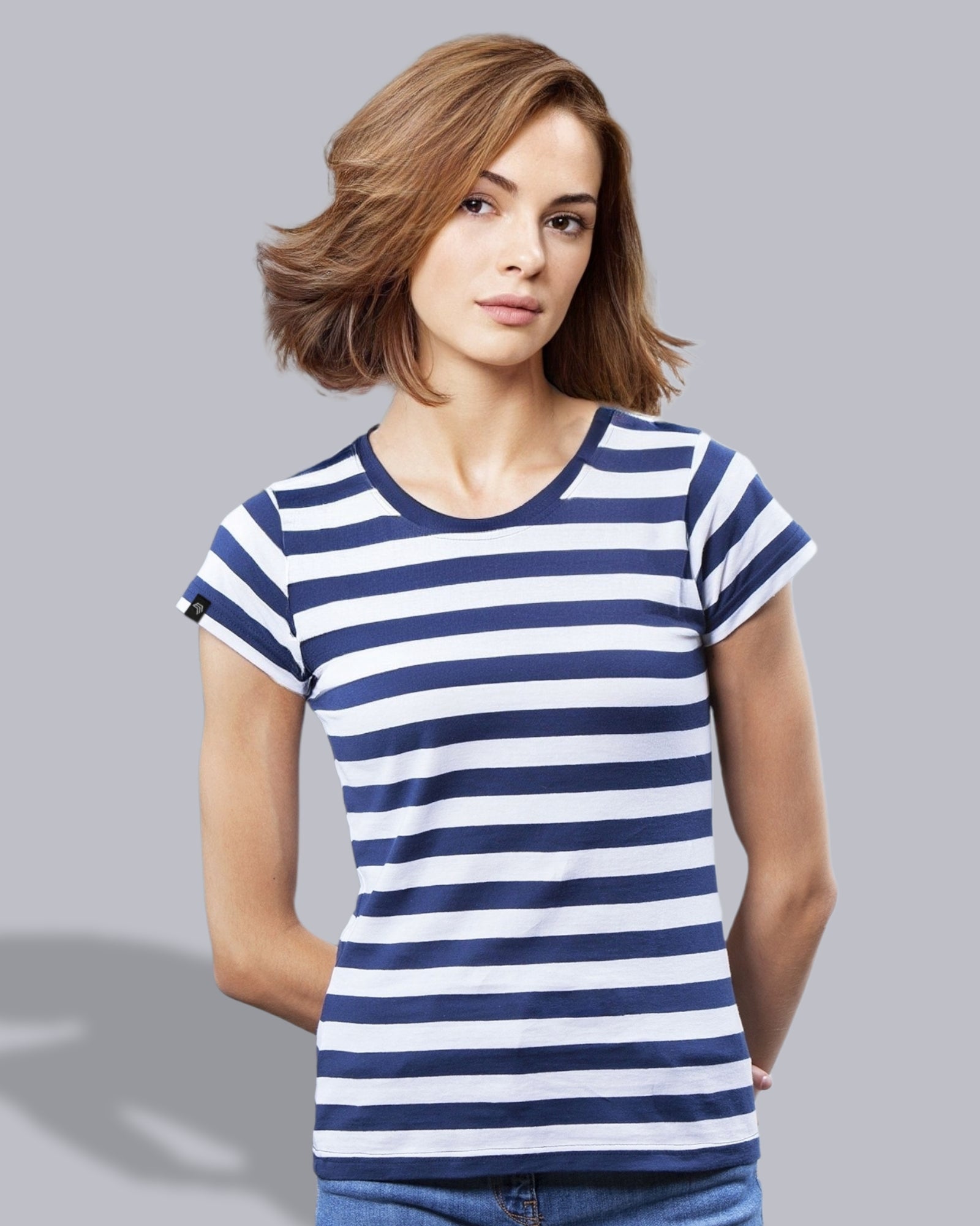 4 more colors available » Modell "MTS M110" ― Ladies' Stripy TShirt. Material: 150 gsm. 100% cotton, ring-spun and combed. Ultra smooth single jersey. 2 cm x 2 cm yarn dyed striped fabric. Fine narrow neck rib. Reinforced neck tape. Capped sleeves. Size chart at pictures: Please compare your measurements before purchasing! // MTSM110S