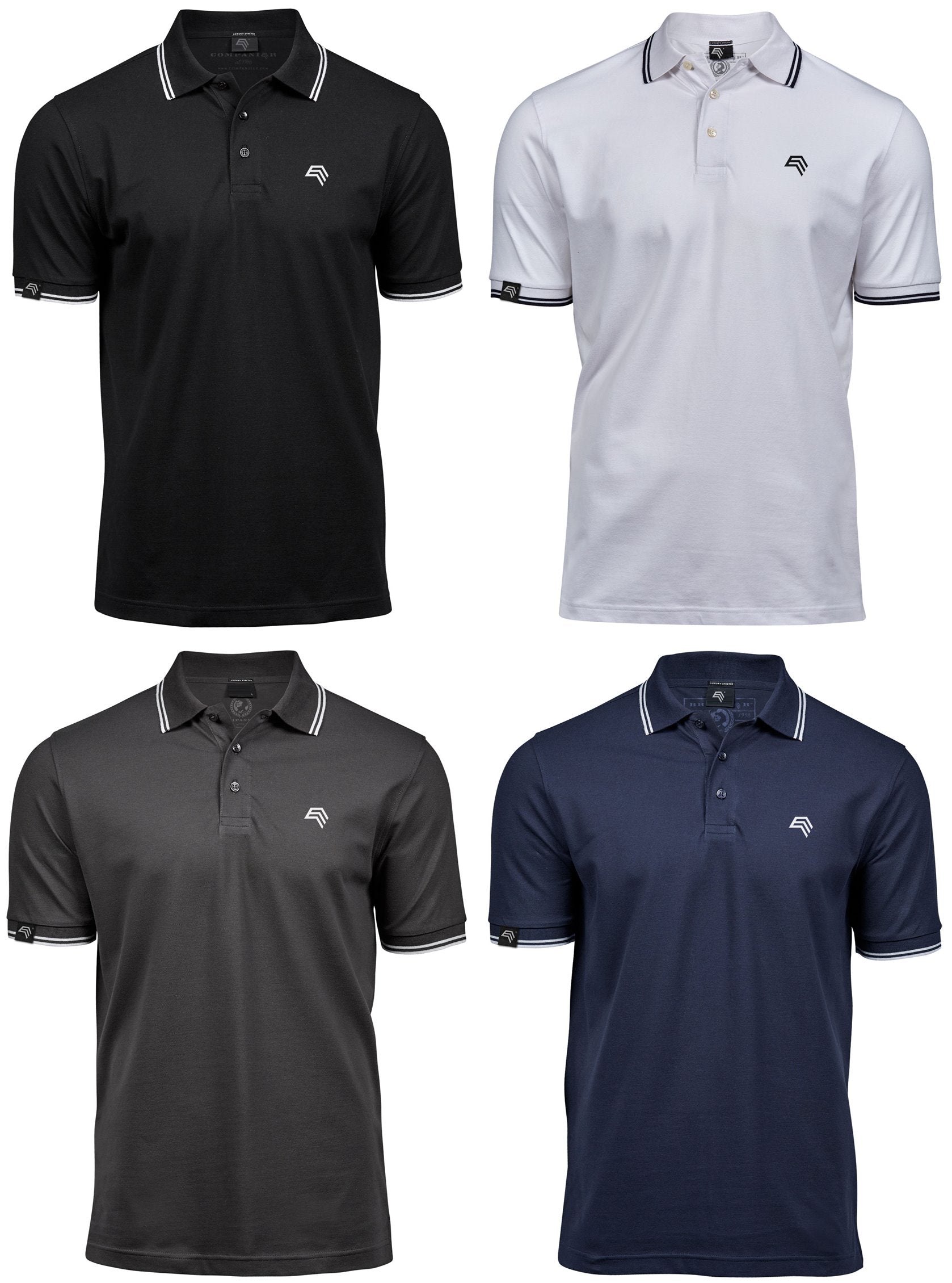 More colors available » Model "TJS 1407" ―Men's Luxury Stretch Elasthan Spandex Contrast Polo Shirt. Material: 215g/m², 95% cotton (organic cotton, combed ringspun), 5% elastane, mini piqué, double preshrunk, tailored fit, striped flat knit collar with lycra®, clean finished placket, double seams on shoulder arm and hem, shoulder- and necktape, 3 matching buttons, striped cuffs, side vents. // Polos Poloshirts TJS1407
